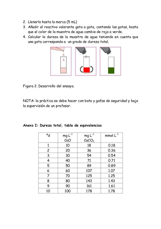 WebEl Centro de Estudios Hidrográficos del Centro de Estudios y Experimentación de Obras Públicas establece una clasificación para la dureza del agua, que se mide en miligramos. WebA continuación, puedes acceder a consultar la dureza del agua de tu zona de residencia, así como su composición fisicoquímica. También te puedes descargar los resultados. WebA continuación se presentan algunos pasos sobre cómo puedes averiguar la dureza de tu agua: 1. Haz una llamada. Preguntar directamente a la compañía de aguas:Debes. WebEn las distintas ciudades de España tendremos distintas durezas del agua, pues la dureza está muy ligada a la zona por donde discurre o se almacena el agua. En zonas de. WebSi el agua se torna de color rojizo significa que contiene exceso de cal, por tanto es agua dura. Si el agua toma un color azulado no existe una alta concentración de cal. Si. WebLa dureza del agua se mide en miligramos de carbonato cálcico por litro (Mg/l) y dependiendo de la concentración de sales de calcio y magnesio podremos clasificarla.. WebUsa un kit de titulación para la dureza del agua. Esta prueba es más exacta y podrás conseguirla en internet o en algunas tiendas de piscinas. Por lo general, tendrás que. WebDe acuerdo a los grados Fahrenheit. El agua es considerada muy dura, cuando tiene más de 30°f, Es considerada de dureza media cuando contiene de entre 15° a 30°f. Y se cree. WebCómo analizar la dureza del agua. Tuandco.com te enseña cómo analizar la dureza de tu hogar para que puedas realizarlo tú mismo. Aprenderás a medir la dureza del agua de. WebDeterminar la dureza del agua en un acuario. 1. Compra un kit de medición para la dureza del carbonato y la general. A diferencia del agua de grifo convencional en la.