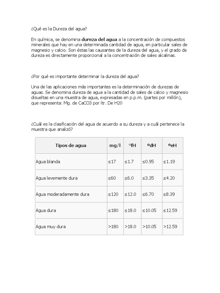 WebResumen: Cómo medir la dureza del agua · 0 a 60 mg/L agua blanda · 61 a 120 mg/L, moderadamente dura · 121 a 180 mg/l, agua dura · por encima de 180mg/L agua muy. WebHola amigos, en el siguiente vídeo les muestro como hacer un test de dureza al agua con el probador de dureza "HI 3812 hardness test kit" y a través de la c... WebEl Centro de Estudios Hidrográficos del Centro de Estudios y Experimentación de Obras Públicas establece una clasificación para la dureza del agua, que se mide en miligramos. WebA continuación, puedes acceder a consultar la dureza del agua de tu zona de residencia, así como su composición fisicoquímica. También te puedes descargar los resultados. WebA continuación se presentan algunos pasos sobre cómo puedes averiguar la dureza de tu agua: 1. Haz una llamada. Preguntar directamente a la compañía de aguas:Debes.