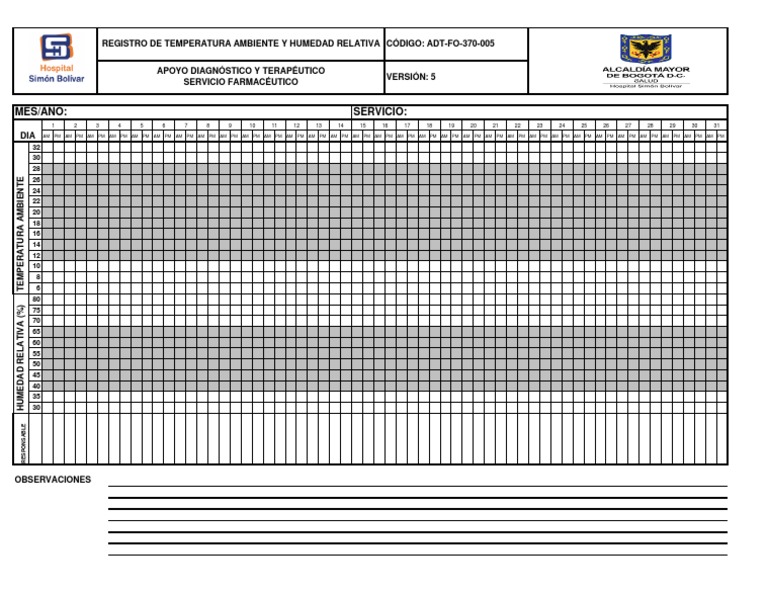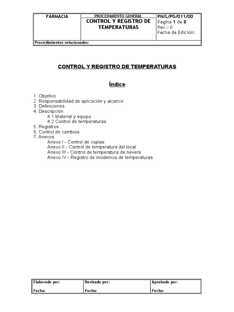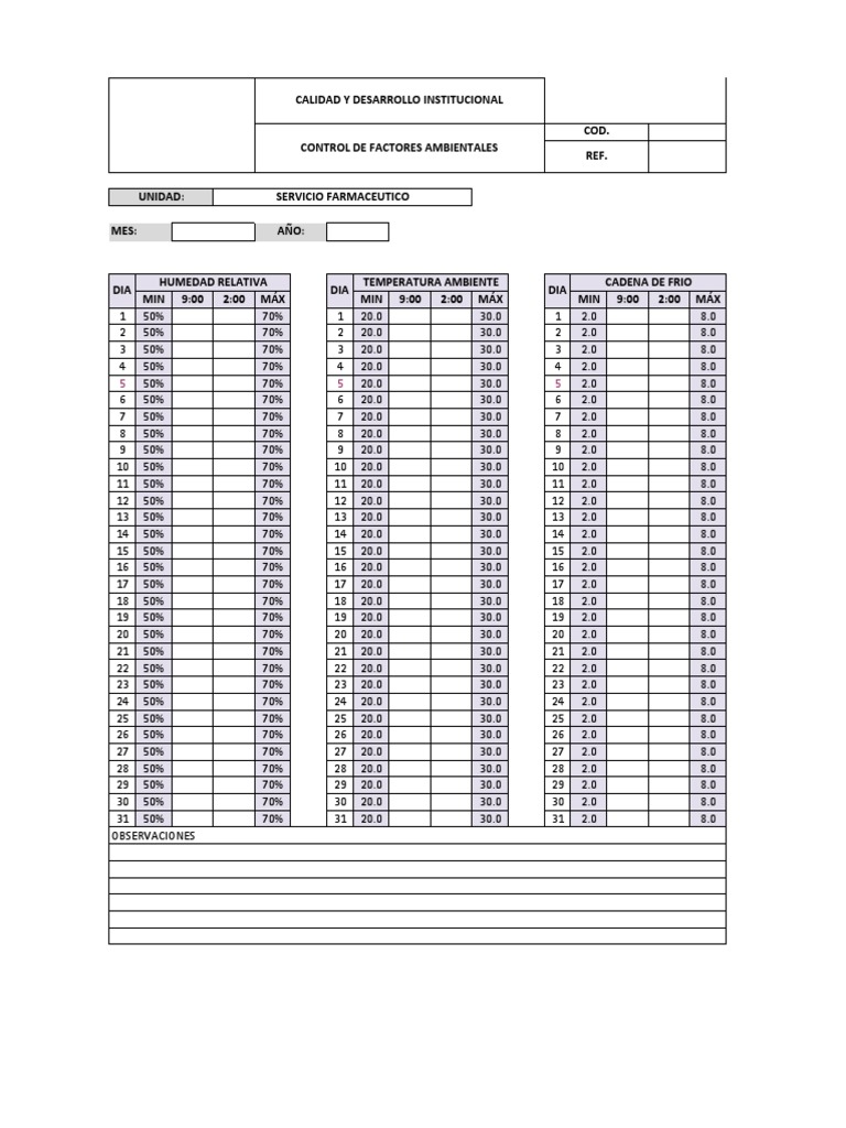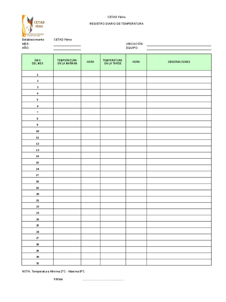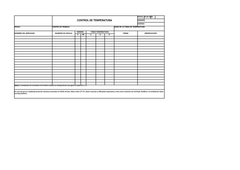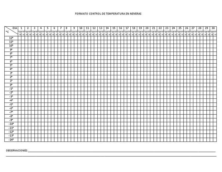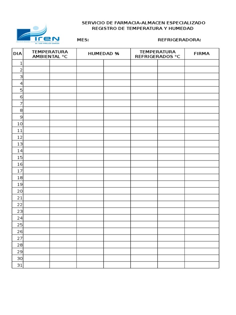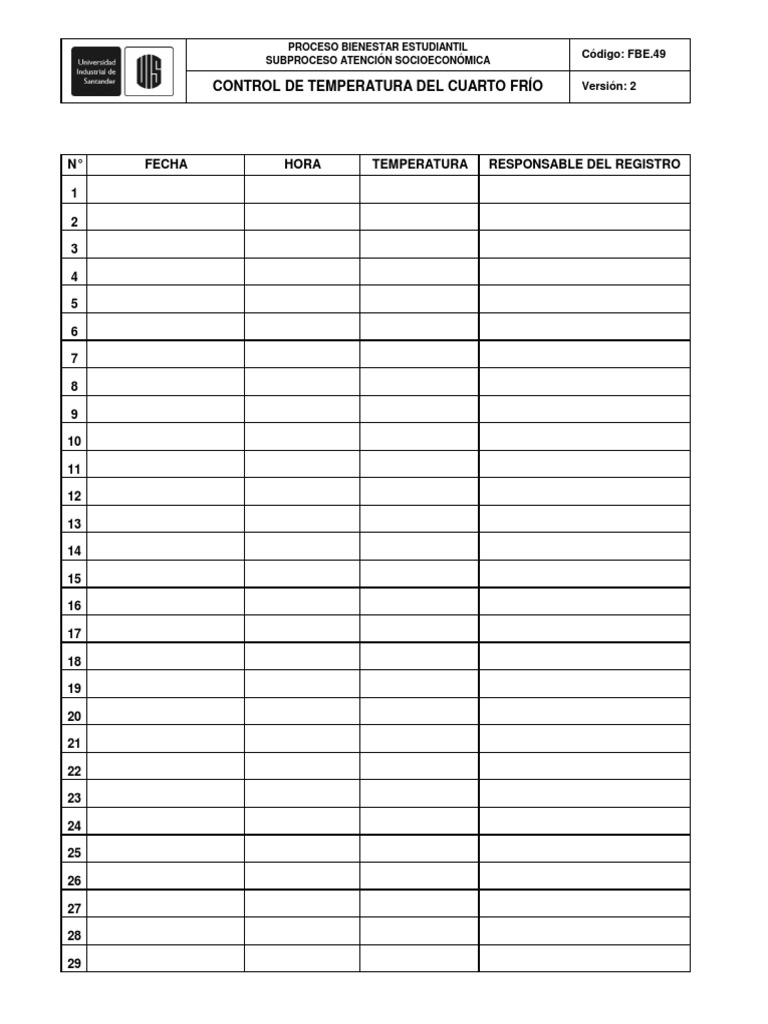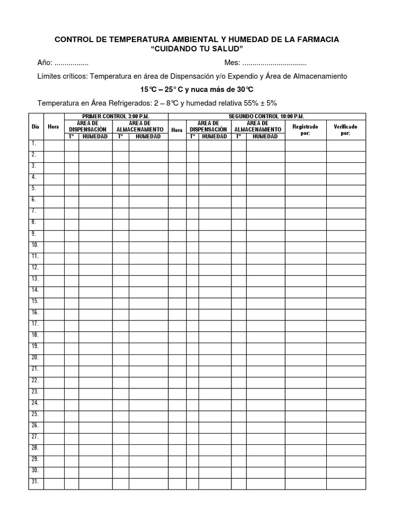 WebPrimero, se ingresa la temperatura que se desea en el proceso o recinto que se debe controlar. Cuando el controlador ya tiene el dato de la temperatura que se. WebUna hoja de registro de temperatura sirve como formulario de control y procedimiento de verificación para los pasos que necesitan cualquier tipo de. Webdigital, así como un sistema de registro de temperaturas. El control y registro de las temperaturas se recomienda realizarlo, al menos, una vez al día, y comprobar que no se. WebUn sistema de registro de la temperatura con una función de alerta le ayuda a supervisar sus frigoríficos médicos, congeladores médicos, congeladores de. WebRegistro Control Temperatura y Humedad. FORMATO REGISTRO CONTROL DE TEMPERATURA Y HUMEDAD RELATIVA AREA: DIA 1 2 MES: 3 4 5 6 7 8 9 10 11 12. WebUn registrador de temperatura, como los termómetros irreversibles, nos permite de forma desasistida registrar alteraciones en las temperaturas correctas. En resumen, registrar la. WebUna hoja de registro de temperatura sirve como formulario de control y procedimiento de verificación para los pasos que necesitan cualquier tipo de acción. Web1. OBJETIVO. Monitorear las condiciones de temperatura y humedad relativa en el área de farmacia y mantener el correcto uso del (Termo higrómetro). 2. ALCANCE. Aplica para.