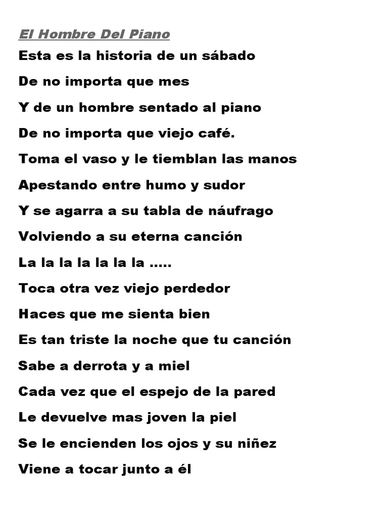 WebAcordes, Letra y Tablatura de la canción El hombre del piano de Guillermo Guido. WebAcordes, Letra y Tablatura de la canción El hombre del piano de Victor Manuel (Victor. WebLetra y Acordes. mejor. versión. G 320000 C9 X32030 Cmaj7 335453 C C9 Vuelve Am G. WebEL HOMBRE DEL PIANO (TUTORIAL) BILLY JOEL. Angelos Tutoriales.. WebAprende a tocar el cifrado de El Hombre del Piano (Ana Belén) en Cifra Club. Esta es la. WebEl Hombre Del Piano, Ana Belen (armonica) El Hombre Del Piano, Ana Belen. (armonica). WebEl Hombre del Piano Lyrics. Esta es la historia de un s bado. de no importa que mes. y. WebTÍTULO: El Hombre Del Piano No es una reproducción totalmente fiel del original, pero. WebVictor Manuel, El hombre del piano, letra y acordes de El hombre del piano de Victor.