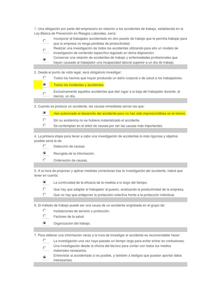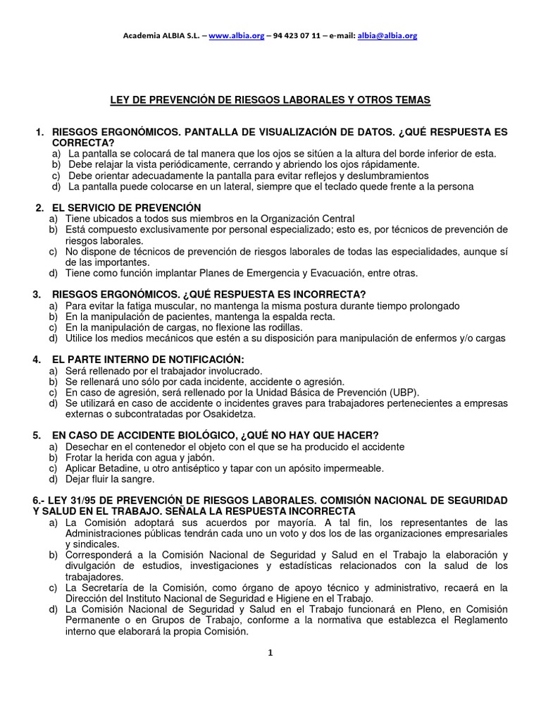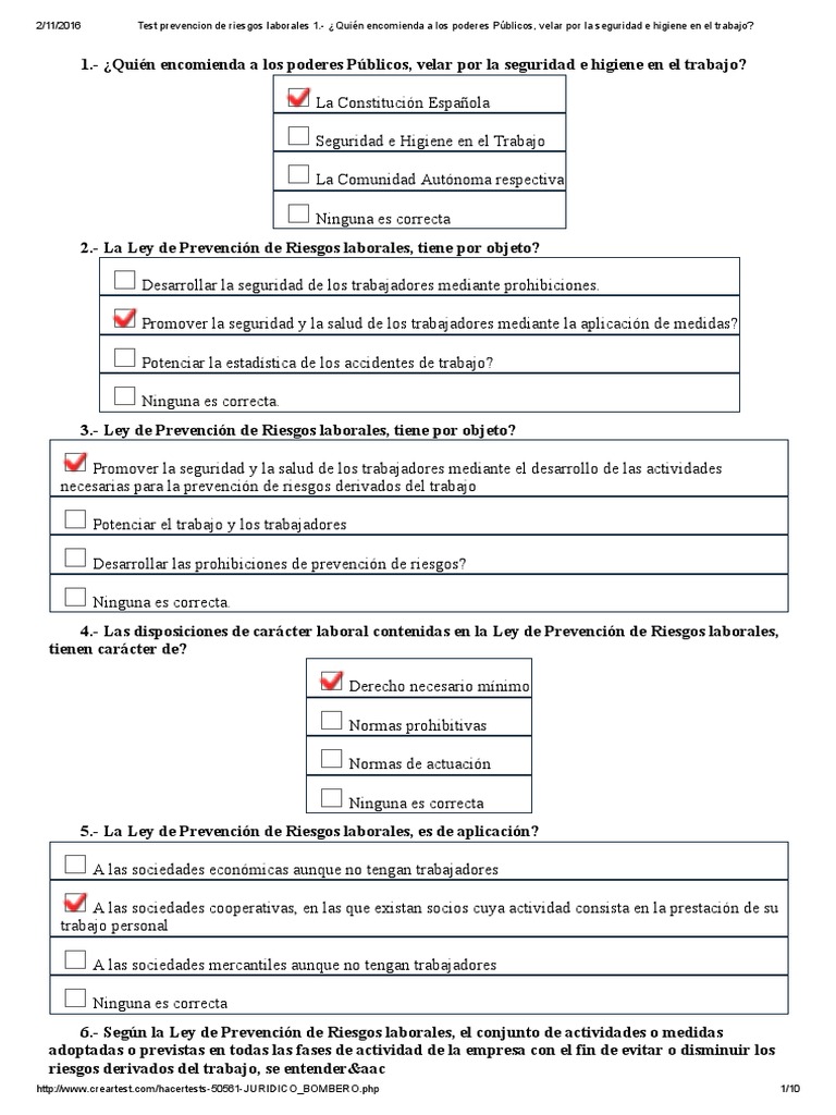 WebEl principal derecho que poseen los trabajadores en materia de prevención es una protección eficaz en materia de seguridad y salud en el trabajo. Los trabajadores no. Web1. La Ley de Prevención de Riesgos Laborales establece los principios generales relativos a la prevención de los riesgos profesionales para: la protección de la seguridad y de la. WebTest Capítulo 1 prevención riesgos laborales Descarga la APP de Test de Leyes para Android para tener mayor cantidad de test, todos explicados y con la. WebLey 31/1995, de 8 de noviembre, de Prevención de Riesgos Laborales. Test Capítulo I Test 1 >> 16 preguntas Test Capítulo II Test 1 >> 20 preguntas Test Capítulo III Test 1 >> 22. WebDescargar Ley LRPL de prevención de riesgos laborales gratis y actualizada. Descarga en PDF la ley 31/1995 de prevención de riesgos laborales de manera totalmente. WebEn primer lugar, debe evaluar los riesgos para estudiar la gravedad y urgencia de actuación. Ha de eliminar de forma inmediata los riesgos más urgentes, o.