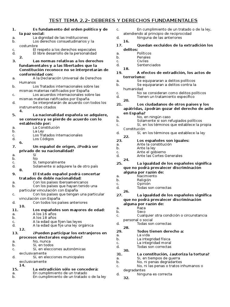 Webtest derechos y deberes fundamentales May 31st, 2020 - test derechos y deberes fundamentales constitucion los derechos fundamentales recogidos en el pero sólo. WebLas normas relativas a los derechos fundamentales y a las libertades que la Constitución reconoce se interpretarán de conformidad con la Declaración Universal de Derechos. WebLas normas relativas a los derechos fundamentales y a las libertades que la Constitución reconoce se interpretarán de conformidad con la Declaración Universal de Derechos. Webtest derechos y deberes fundamentales May 31st, 2020 - test derechos y deberes fundamentales constitucion los derechos fundamentales recogidos en el pero sólo. Weba) Todos los españoles pero no los extranjeros no legalizados. b) Todos los ciudadanos de la Unión Europea y los españoles, pero no los extranjeros ajenos a ese ámbito c) Todas. WebEs la norma suprema de un Estado de Derecho. Desde un punto de vista material la Constitución es un conjunto de normas o reglas fundamentales que se aplican en el. WebTest de principios generales y estructura de la Constitución Española. Test de la Constitución Española. Preguntas aleatorias con respuestas múltiples sobre principios. WebInformación y test de Título I. De los derechos y deberes fundamentales. Te damos información sobre Constitución. Además, si te suscribes, podrás hacer test. Weba) Los españoles tienen el deber y la obligación de defender a España. b) Los españoles tienen el derecho y el deber de defender a España. c) Los españoles tienen el derecho y.